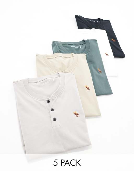 Abercrombie & Fitch - Pakke med 5 par henley-T-shirts med ikonisk logo i sort/grå/gråbrun/hvid