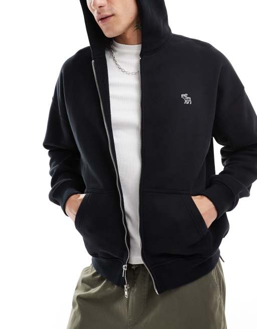 Abercrombie & Fitch - Sort hættetrøje med gennemgående lynlås og broderet ikonlogo