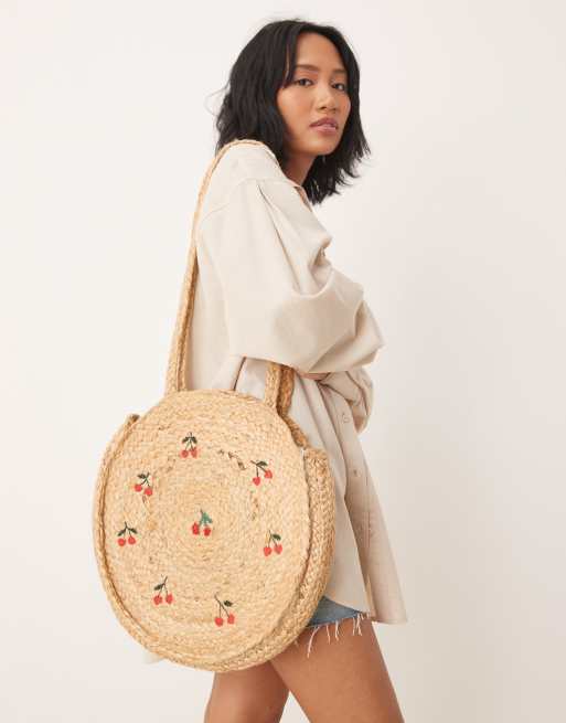 Accessorize - Beige rund skuldertaske med kirsebærmønster i jute