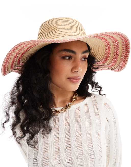 Accessorize - Naturfarvet sommerhat med bred skygge og pink stikninger