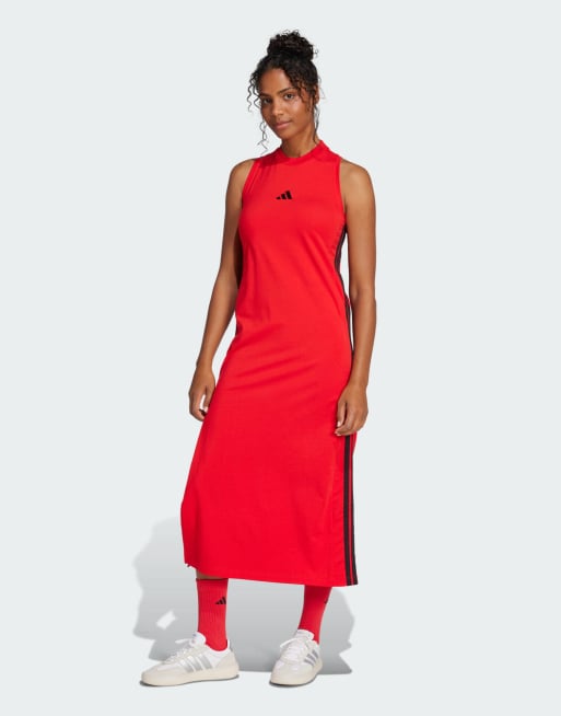 adidas Performance - Essentials - Rubinrød/sort og lang kjole med racerryg og 3 striber