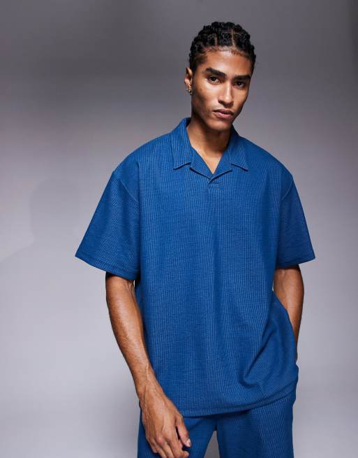 ADPT - Denimblå poloskjorte med tekstur og slids i halsen