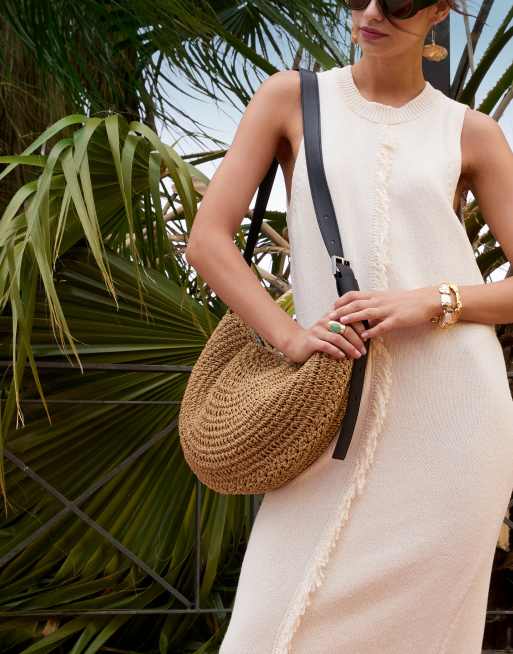 AllSaints - Naturfarvet brun skuldertaske i strå med tekstur og halvmåneform