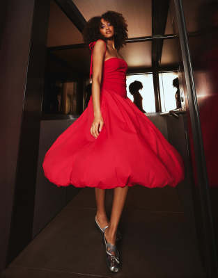 Amy Lynn - Alexa - Kirsebærrød puf-midikjole med bindebånd på skulderen