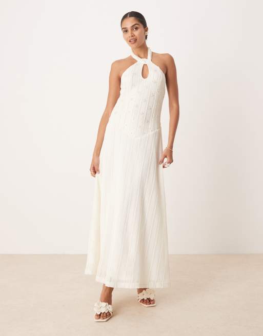 Amy Lynn - Cremehvid strikket maxikjole med halterneck, lavtsiddende kant og udsmykninger