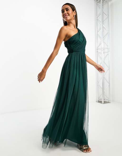 Anaya - Brudepiger - Smaragdgrøn oneshoulder-kjole i tyl i maxilængde