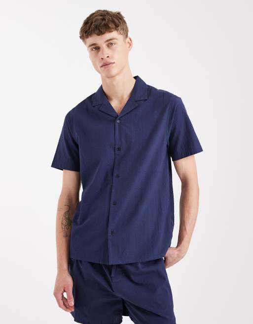 Aray - Marineblå strandskjorte med korte ærmer i bæk-og-bølge-stof