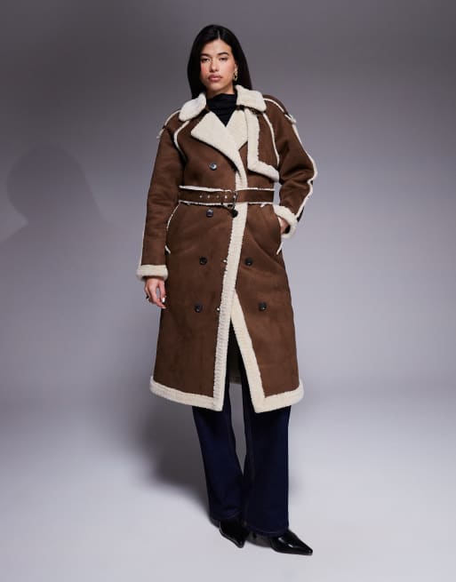 Aria Cove - Chokoladebrun og cremehvid lang frakke med bælte i imiteret ruskind og shearling-look