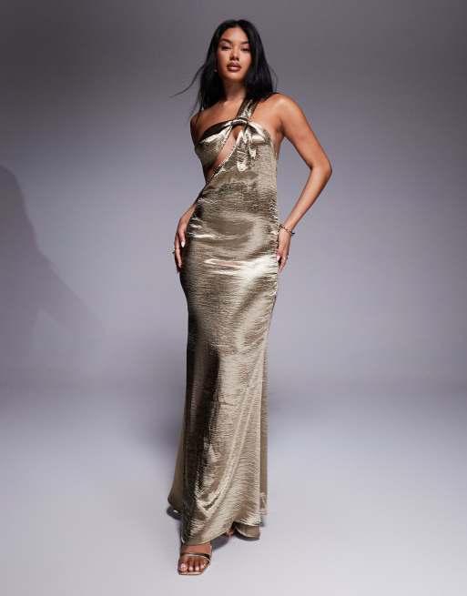 Aria Cove - Guldfarvet maxikjole i satin med oneshoulder og åben ryg samt fishtail-snit samt udhamret tekstur