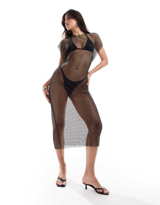 Aria Cove - Højhalset strandkjole uden ærmer med gennemgående rhinstensudsmykning i sort mesh
