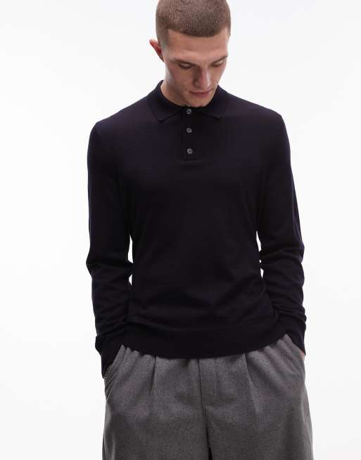 ARKET - Langærmet sort poloskjorte i kraftig merinould