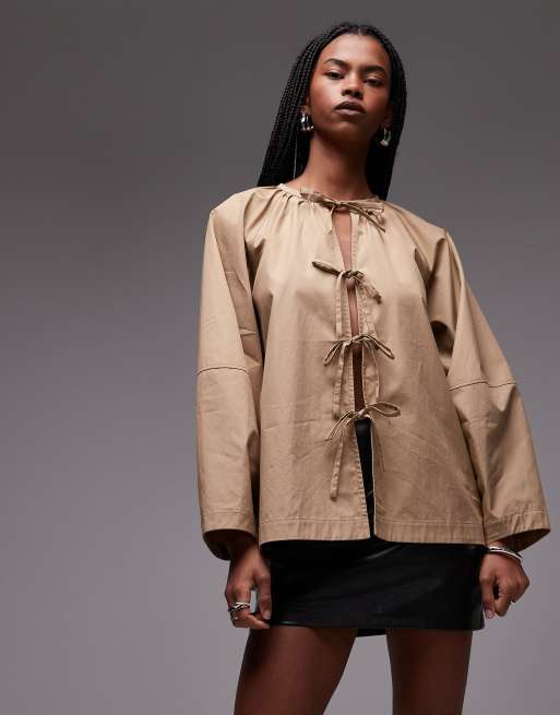 ARKET - Mørk beige oversized bluse med sløjfedetaljer foran