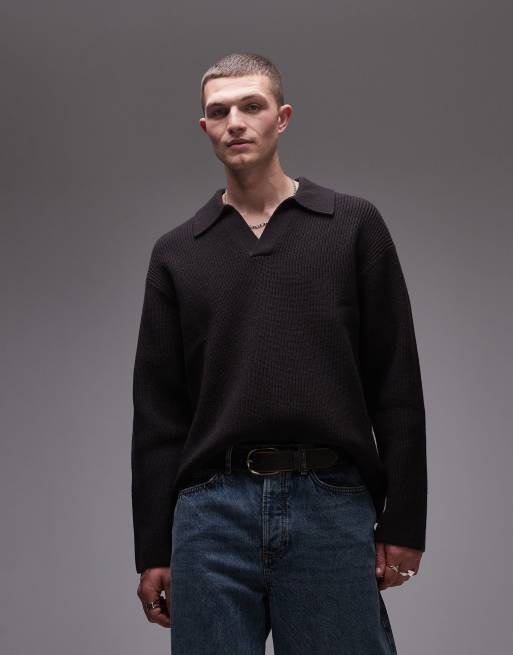 ARKET - Mørkebrun og ribstrikket trøje i uld med polokrave