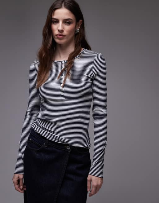 ARKET - Sort og hvid overdel med lange ærmer, knapstolpe og striber i jersey