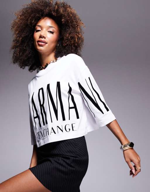 Armani Exchange - Hvid cropped løstsiddende T-shirt med stort logoprint