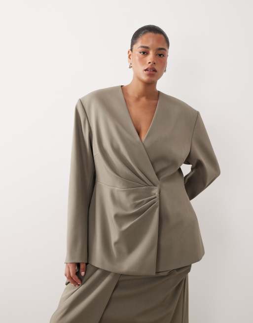 ARRANGE Curve - Lysegrå plisseret slå-om-blazer uden krave med indsyet talje