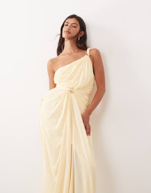 ARRANGE - Lysegul maxikjole med oneshoulder-design og draperinger samt snonings- og metaldetalje