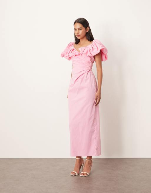 ARRANGE - Lyserød maxikjole med bardotsnit og rynker samt pufærmer