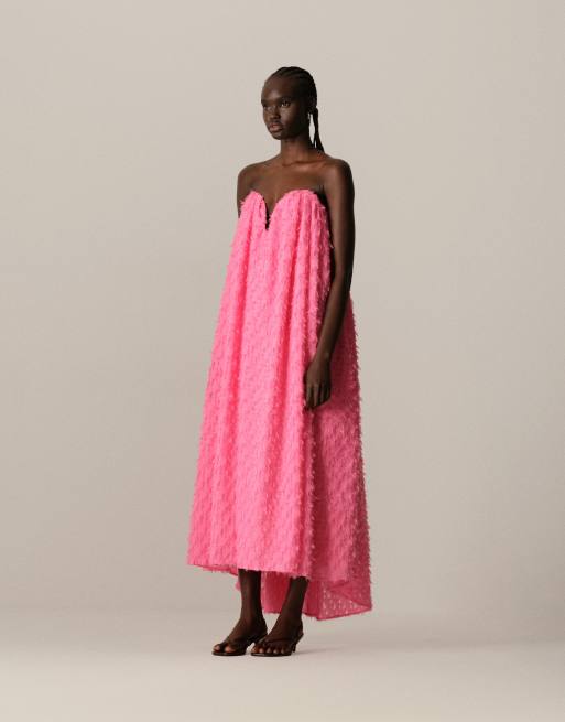 ARRANGE - Pop-pink voluminøs bandeau-maxikjole med korsetdetaljer og tekstur