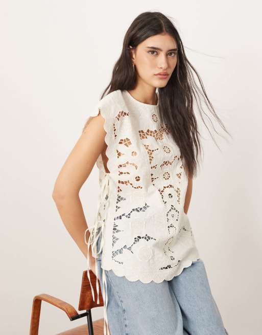 ARRANGE - Råhvid top med bindebånd i siden og udskårne broderier i bomuld