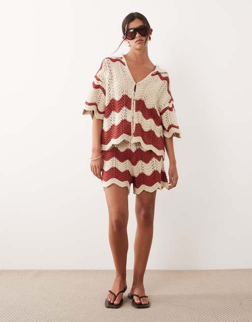 ARRANGE - Rustrødt og beigestribet sæt i hæklet materiale bestående af shorts og top
