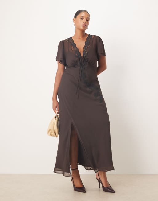 ASOS DESIGN - Brun midikjole med blondedetalje og bindebånd foran