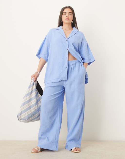ASOS DESIGN Curve - Blåt sæt med skjorte og bukser med rå kantdetalje i ostelærred