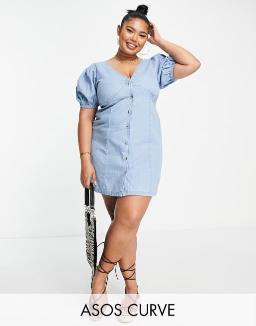 ASOS DESIGN Curve - Blød tea-minikjole med synlige sømme i blå denim
