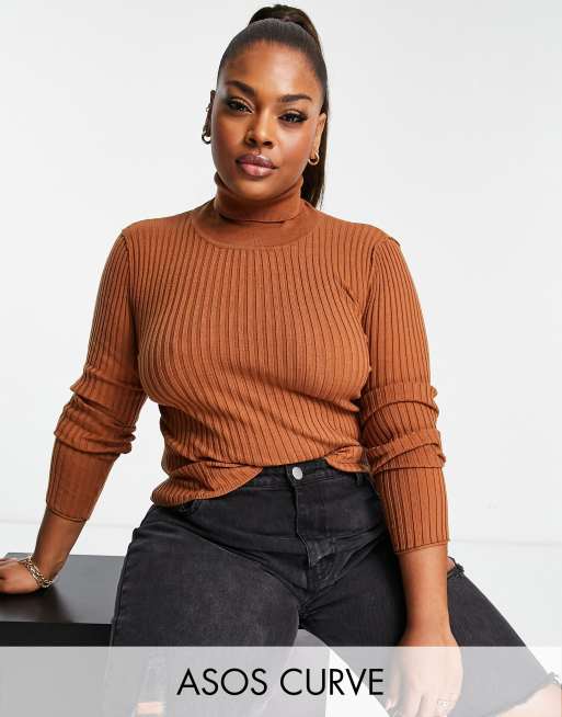ASOS DESIGN Curve - Brun ribstrikket rullekravebluse