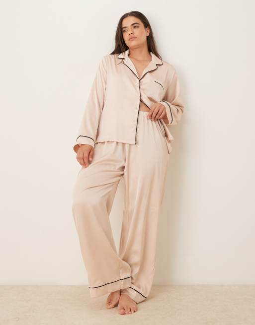ASOS DESIGN Curve - Champagne-lyserødt pyjamassæt med skjorte og bukser i satin
