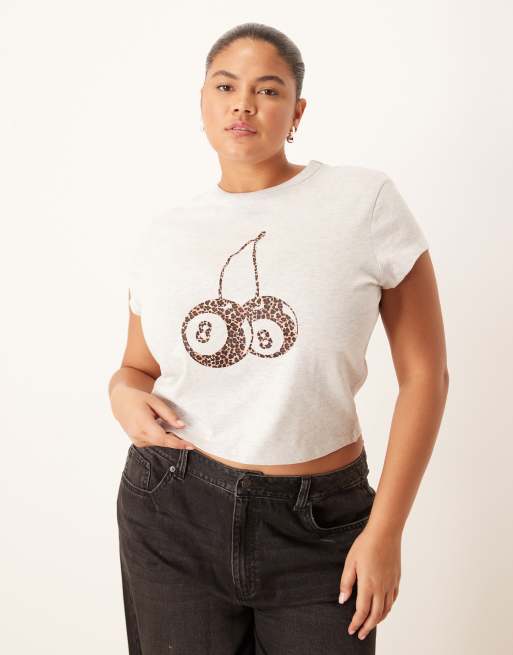 ASOS DESIGN Curve - Hvidmeleret baby-t-shirt med kirsebærgrafik med leopardprint