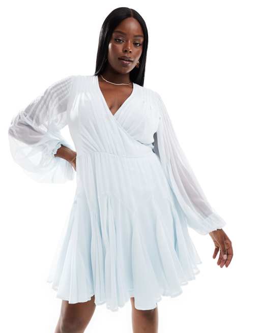 ASOS DESIGN Curve - Isblå slå-om-minikjole med ballonærmer og bindebånd i taljen