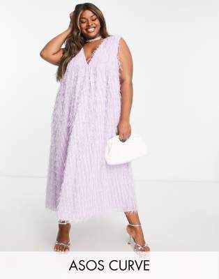 ASOS DESIGN Curve - Lagdelt og vamset lyslilla midikjole med skulderpuder og v-hals