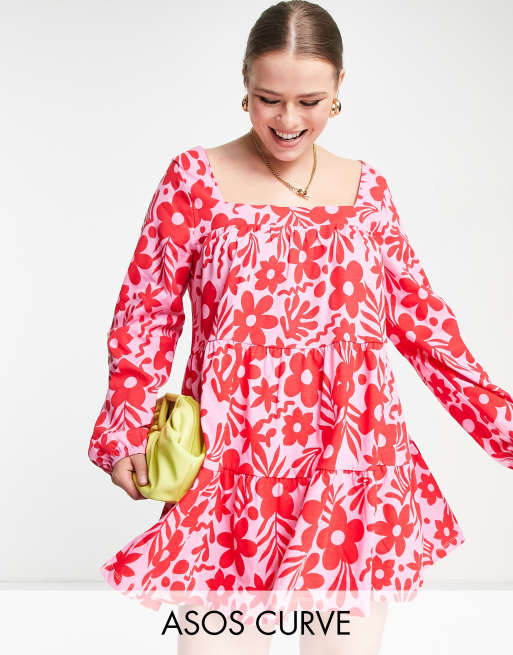 ASOS DESIGN Curve - Lagdelt smock-minikjole med firkantet hals i rødt og pink blomstermønster