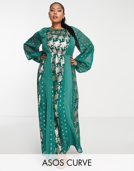 ASOS DESIGN Curve - Metalfarvet midikjole med elastik i ryggen i fyrretræsgrøn jacquard