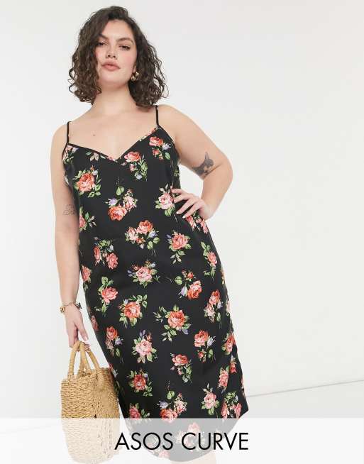 ASOS DESIGN Curve - Midi-slip-kjole i sort med tynde stropper og blomstermønster