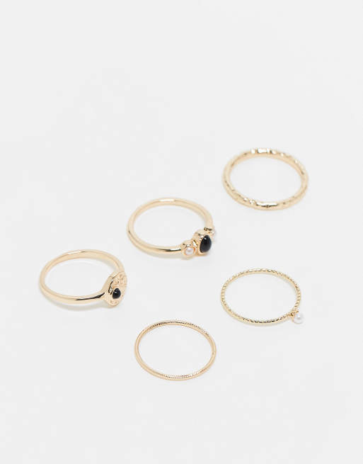 ASOS DESIGN Curve - Pakke med 5 guldfarvede ringe med sorte sten og imiterede perler