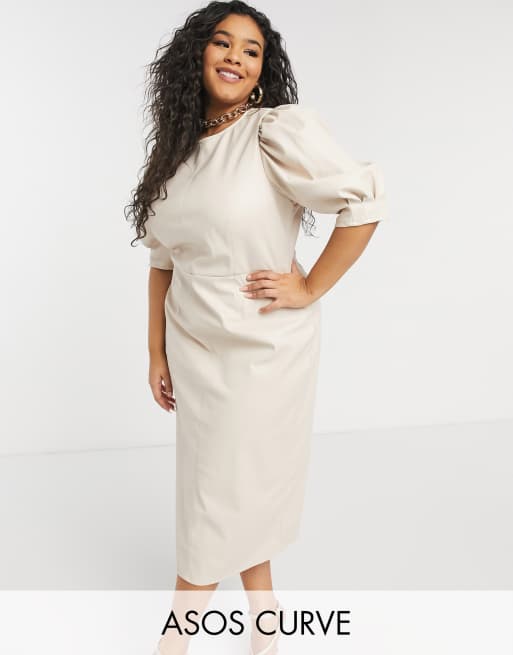 ASOS DESIGN Curve - Pencilnederdel midikjole i læderlook med pufærmer i stenfarve