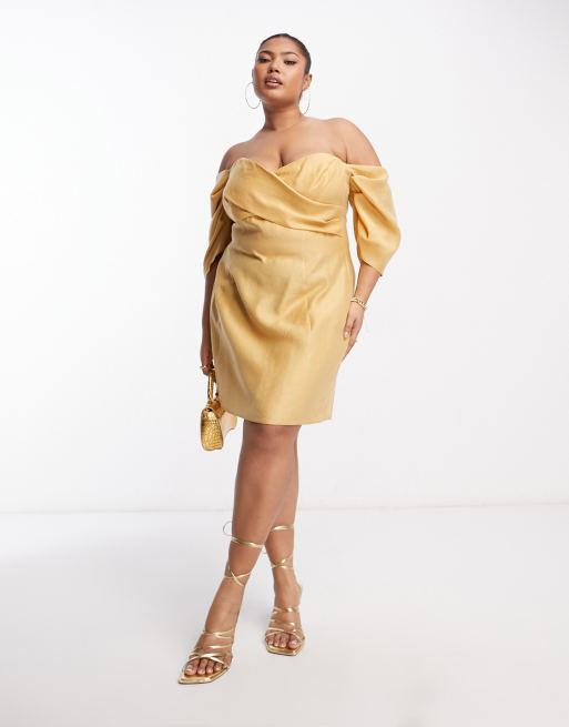 ASOS DESIGN Curve - Plisseret offshoulder-minikjole med slå-om-detalje på brystet i beige vask