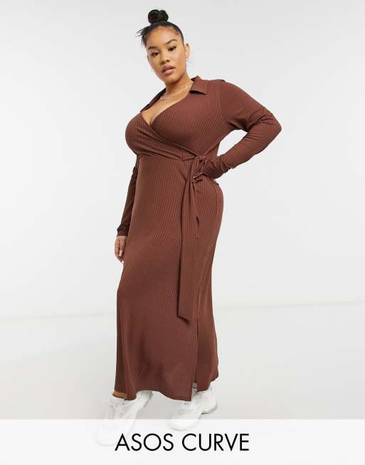 ASOS DESIGN Curve - Ribstrikket slå-om-midikjole med lange ærmer i chokoladebrun