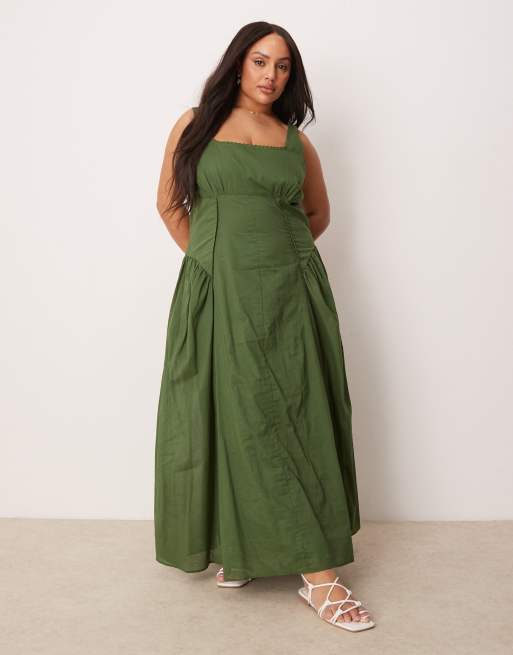 ASOS DESIGN Curve - Skovgrøn maxi-sommerkjole med firkantet præriehals og sænket talje