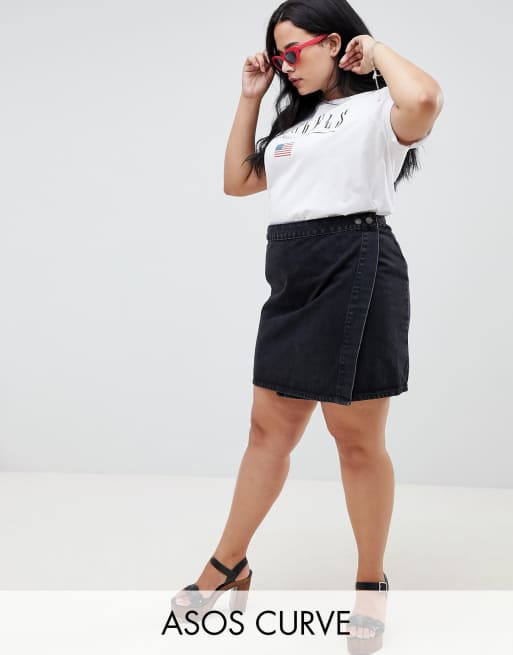 ASOS DESIGN Curve - Slå-om-nederdel i sortvasket denim