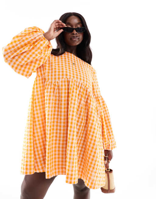 ASOS DESIGN Curve - Smock-minikjole med tekstur og orange/lyserøde gingham-tern