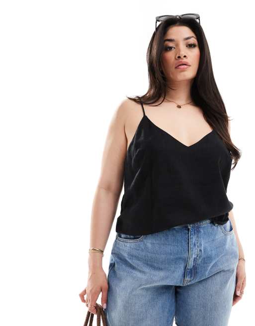 ASOS DESIGN Curve - Sort cami med V-hals i hørlook