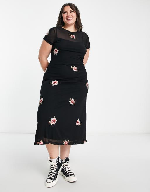ASOS DESIGN Curve - Sort midikjole med broderi i mesh