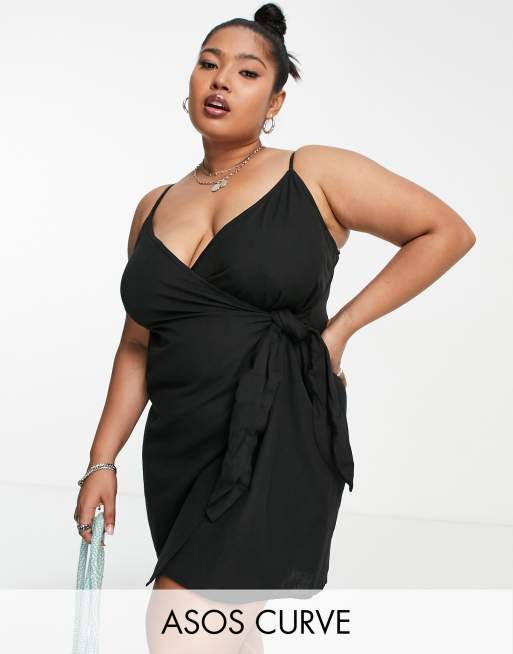 ASOS DESIGN Curve - Sort mini-sommerkjole i hør med cami-stropper og bindebånd i siden