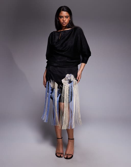 ASOS DESIGN Curve - Sort minikjole i satin med broderi og frynser
