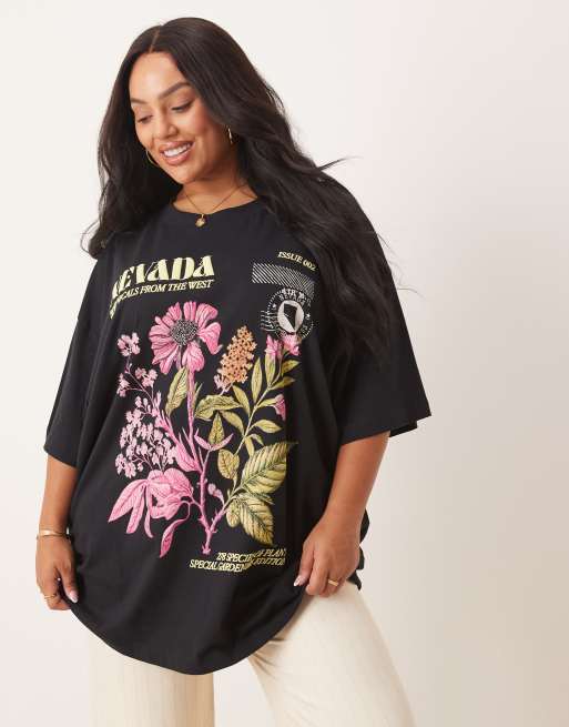 ASOS DESIGN Curve - Sort og oversized T-shirt med blomster- og "Nevada"-grafik