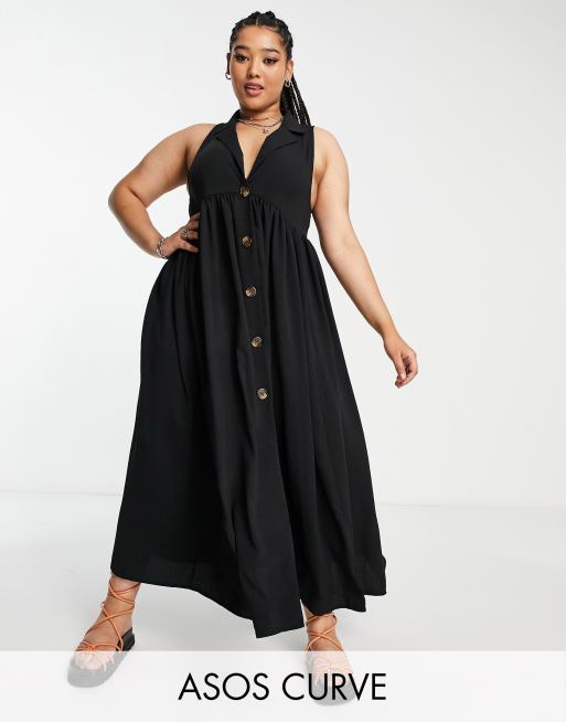 ASOS DESIGN Curve - Sort smock-midikjole med krave og knapper