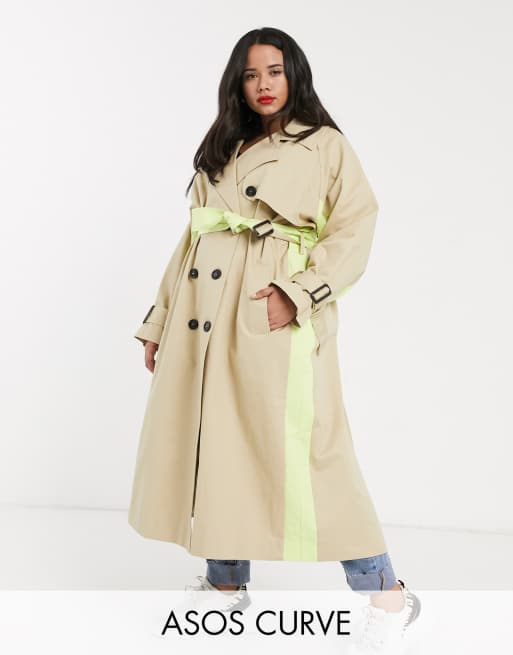 ASOS DESIGN Curve - Stenfarve trenchcoat med neonfarvet indlæg